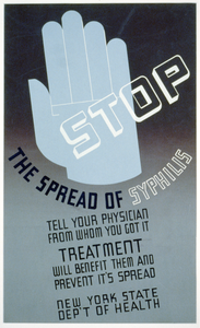 TITLE: Stop the spread of syphilis Tell your physician from whom you got it : Treatment will benefit them and prevent it's [sic] spread. CALL NUMBER: POS - WPA - NY .K358, no. 3 (B size) [P&P] REPRODUCTION NUMBER: LC-USZC2-838 (color film copy slide)LC-USZ62-59984 (b&w film copy neg.) RIGHTS INFORMATION: No known restrictions on publication. SUMMARY: Poster promoting treatment of syphilis. MEDIUM: 1 print on board (poster) : silkscreen, color. CREATED/PUBLISHED: NYC : Works Progress Administration Federal Art Project, [between 1936 and 1939] CREATOR: Kaplan, Ben, artist. NOTES: Date stamped on verso: Jun 28 1939. Work Projects Administration Poster Collection (Library of Congress). Posters of the WPA / Christopher DeNoon. Los Angeles : Wheatly Press, c1987, no. 228 SUBJECTS: Syphilis--New York (State)--1930-1940. Health care--New York (State)--1930-1940. FORMAT: Posters 1930-1940.Screen prints Color 1930-1940. REPOSITORY: Library of Congress Prints and Photographs Division Washington, D.C. 20540 USA DIGITAL ID: (color film copy slide) cph 3b48738 http://hdl.loc.gov/loc.pnp/cph.3b48738 (b&w film copy neg.) cph 3b07724 http://hdl.loc.gov/loc.pnp/cph.3b07724 VIDEO FRAME ID: LCPP003B-48738 (from color film copy slide)LCPP003B-07724 (from b&w film copy neg.) CONTROL #: 98516191