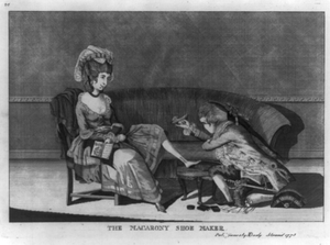 TITLE: The macarony shoe maker CALL NUMBER: PC 1 - 4638 (A size) [P&P] REPRODUCTION NUMBER: LC-USZ62-85712 (b&w film copy neg.) RIGHTS INFORMATION: No known restrictions on publication. SUMMARY: Woman seated with her leg on a stool, holding up her skirt, as a shoemaker kneels before her, about to adjust a very little shoe to her foot. She wears an enormous headdress and holds a book, The Whole Duty of Man. The shoemaker is dressed in the extreme of the macaroni fashion. MEDIUM: 1 print : engraving. CREATED/PUBLISHED: [ca. 1770] NOTES: Engraving published by M. Darly. Forms part of : British Cartoon Prints Collection (Library of Congress). This record contains unverified data from caption card. Caption card tracings: Cartoons, Br.; Clothing; Women; Shoes; Pub. Ind. REPOSITORY: Library of Congress Prints and Photographs Division Washington, D.C. 20540 USA DIGITAL ID: (digital file from b&w film copy neg.) cph 3b32237 http://hdl.loc.gov/loc.pnp/cph.3b32237 CONTROL #: 2002714560