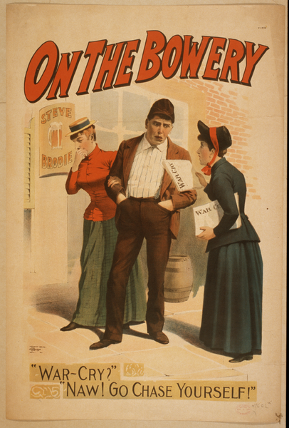TITLE: On the Bowery CALL NUMBER: POS - TH - 1894 .O5, no. 1 (C size) <P&P> [P&P] REPRODUCTION NUMBER: LC-USZC4-9592 (color film copy transparency)LC-USZ62-134582 (b&w film copy neg.) RIGHTS INFORMATION: No known restrictions on publication. MEDIUM: 1 print (poster) : lithograph, color ; 75 x 50 cm. CREATED/PUBLISHED: Cin'ti ; N.Y. : Strobridge Lith. Co., c1894. CREATOR: Strobridge & Co. Lith. NOTES: Z49606 U.S. Copyright Office Created and "copyright 1894 by The Strobridge Lith Co, Cin'ti., N.Y." Caption: War-cry? Naw! Go chase yourself! No. 6126. SUBJECTS: Temperance. Intoxication. Theatrical productions. FORMAT: Theatrical posters American.Lithographs Color. PART OF: Theatrical Poster Collection (Library of Congress) REPOSITORY: Library of Congress Prints and Photographs Division Washington, D.C. 20540 USA DIGITAL ID: (digital file from intermediary roll copy film) var 0732 http://hdl.loc.gov/loc.pnp/var.0732 (digital file from color film copy transparency) cph 3g09592 http://hdl.loc.gov/loc.pnp/cph.3g09592 (digital file from b&w film copy neg.) cph 3c34582 http://hdl.loc.gov/loc.pnp/cph.3c34582 CONTROL #: var1994000781/PP