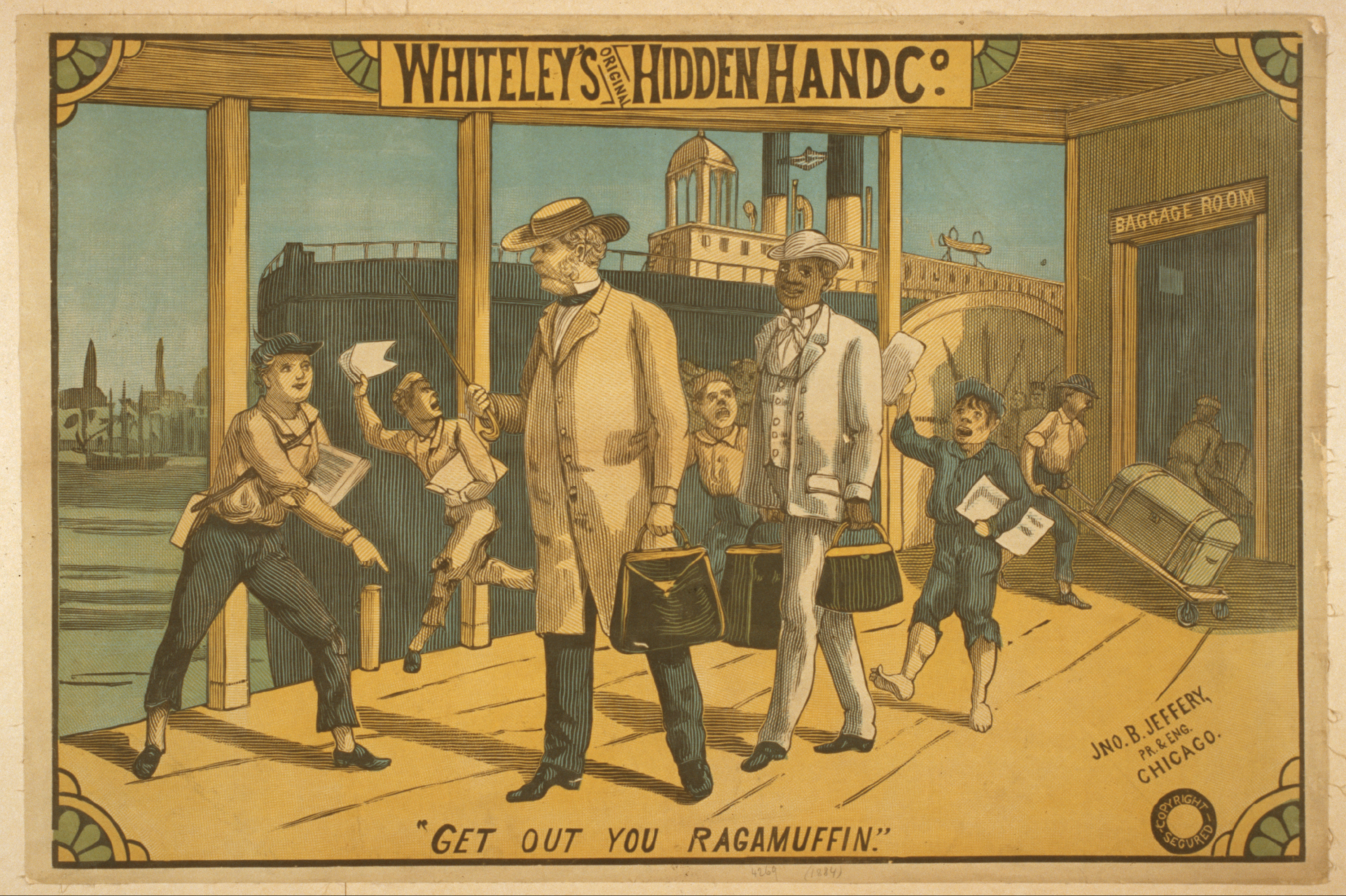 TITLE: Whiteley's Original Hidden Hand Co. CALL NUMBER: POS - TH - 1884 .H5, no. 6 (C size) <P&P>[P&P] REPRODUCTION NUMBER: LC-USZC4-9718 (color film copy transparency) RIGHTS INFORMATION: No known restrictions on publication. MEDIUM: 1 print (poster) : woodcut, color ; 70 x 105 cm. CREATED/PUBLISHED: Chicago : Jno. B Jeffery Pr. & Eng. [1884] CREATOR: Jno. B. Jeffery Pr. & Eng. RELATED NAMES: Whiteley's Original Hidden Hand Co. NOTES: P4269 U.S. Copyright Office Created by "Jno. B. Jeffery, Pr. & Eng., Chicago." "Copyright secured." Caption: "Get out you ragamuffin." SUBJECTS: Arrivals & departures. Children & adults. Newspaper vendors. Piers & wharves. Theatrical productions. FORMAT: Theatrical posters American.Woodcuts Color. OTHER TITLE: Hidden hand. PART OF: Theatrical Poster Collection (Library of Congress) REPOSITORY: Library of Congress Prints and Photographs Division Washington, D.C. 20540 USA DIGITAL ID: (digital file from intermediary roll copy film) var 0668 http://hdl.loc.gov/loc.pnp/var.0668 (digital file from color film copy transparency) cph 3g09718 http://hdl.loc.gov/loc.pnp/cph.3g09718 CONTROL #: var1994000703/PP