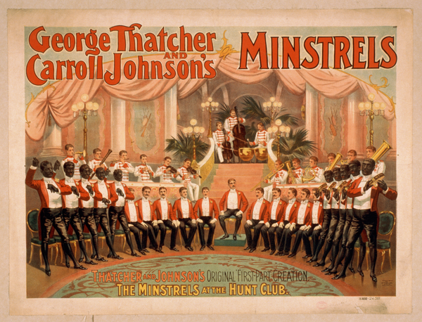 TITLE: George Thatcher and Carroll Johnson's Minstrels CALL NUMBER: POS - MIN - .T533, no. 1 (C size) <P&P>[P&P] REPRODUCTION NUMBER: LC-USZ62-2658 (b&w film copy neg.) RIGHTS INFORMATION: No known restrictions on publication. MEDIUM: 1 print (poster) : lithograph, color ; 76 x 100 cm. CREATED/PUBLISHED: Cinti ; N.Y. : Strobridge Lith. Co., c1895. CREATOR: Strobridge & Co. Lith. NOTES: A24005 U.S. Copyright Office Created and "copyright 1895 by The Strobridge Lith. Co., Cinti=N.Y." Caption: Thatcher and Johnson's original 'first-part' creation, The Minstrels at the Hunt Club. No. 6295. SUBJECTS: George Thatcher and Carroll Johnson's Minstrels--Performances. African Americans--Performances & portrayals. Music ensembles. Minstrel shows. FORMAT: Theatrical posters American.Lithographs Color. PART OF: Minstrel Poster Collection (Library of Congress) REPOSITORY: Library of Congress Prints and Photographs Division Washington, D.C. 20540 USA DIGITAL ID: (digital file from intermediary roll copy film) var 1784 http://hdl.loc.gov/loc.pnp/var.1784 CONTROL #: var1994001720/PP