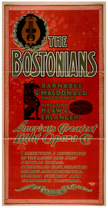 TITLE: The Bostonians America's greatest light opera co. CALL NUMBER: POS - TH - OPT .B67, no. 4 (D size) <P&P>[P&P] REPRODUCTION NUMBER: LC-USZ62-28549 (b&w film copy neg.) RIGHTS INFORMATION: No known restrictions on publication. MEDIUM: 1 print (poster) : lithograph, color ; 203 x 104 cm. CREATED/PUBLISHED: Buffalo, N.Y. : Courier Company, Lith. Dpt., c1900. CREATOR: Courier Co. Lith. Dpt. RELATED NAMES: Barnabee & MacDonald. Klaw & Erlanger. Bostonians (Opera company) NOTES: Created and "copyright 1900 by The Courier Company, Lith. Dpt., Buffalo, N.Y." Barnabee & MacDonald, proprietors; direction, Klaw & Erlanger. "Presenting a repertoire of the latest and most popular operas. Unexcelled cast, selected chorus and orchestra. Special scenery and elaborate costumes." No. 3013. SUBJECTS: Lyres. Griffins. Operas & operettas. FORMAT: Theatrical posters American.Lithographs Color. PART OF: Theatrical Poster Collection (Library of Congress) REPOSITORY: Library of Congress Prints and Photographs Division Washington, D.C. 20540 USA DIGITAL ID: (digital file from intermediary roll copy film) var 1759 http://hdl.loc.gov/loc.pnp/var.1759 CONTROL #: var1995001987/PP