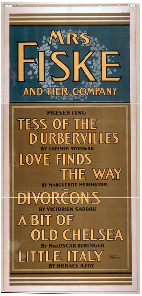 TITLE: Mrs. Fiske and her company presenting Tess of the D'Urbervilles by Lorimer Stoddard, Love finds the way by Marguerite Merington, Divorcons by Victorien Sardou, A bit of old Chelsea by Mrs. Oscar Beringer, Little Italy by Horace B. Fry CALL NUMBER: POS - TH - 1898 .T47, no. 1 (H size) <P&P>[P&P] REPRODUCTION NUMBER: LC-USZ62-19689 (b&w film copy neg.) RIGHTS INFORMATION: No known restrictions on publication. MEDIUM: 1 print (poster) : lithograph, color ; 214 x 101 cm. CREATED/PUBLISHED: Cincinnati ; New York : Strobridge Litho. Co., c1898. CREATOR: Strobridge & Co. Lith. RELATED NAMES: Fiske, Minnie Maddern, 1865-1932. Stoddard, Lorimer. Merington, Marguerite. Sardou, Victorien, 1831-1908. Beringer, Oscar, Mrs., 1856-1936. Fry, Horace B. NOTES: 48679 U.S. Copyright Office Created and "copyright 1898 by The Strobridge Litho Co, Cincinnati & New York." Poster consists entirely of text. N.Y. no. 8170 SUBJECTS: Theatrical productions. FORMAT: Theatrical posters American.Lithographs Color. OTHER TITLE: Tess of the D'Urbervilles.Love finds the way.Divorcons.Bit of old Chelsea.Little Italy. PART OF: Theatrical Poster Collection (Library of Congress) REPOSITORY: Library of Congress Prints and Photographs Division Washington, D.C. 20540 USA DIGITAL ID: (digital file from intermediary roll copy film) var 1975 http://hdl.loc.gov/loc.pnp/var.1975 CONTROL #: var1995002140/PP