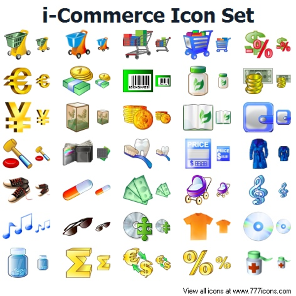Your products will look more modern and attractive with i-Commerce Icon Set. Color formats include Windows XP and 8-bit formats. All icons include 16x16, 24x24, 32x32, 48x48 and 256x256 pixel images. This icon set contains icons representing money, goods and other objects: percent, sum, PDA, GPS-navigator, T-shirt, mp3-player, credit card, delivery, globe and others. Author: 777icons.com Icon quantinty: 164 Icon sizes: 256x256, 48x48, 32x32, 24x24, 16x16 File formats: PNG, GIF, BMP, ICO Image states: normal, hot, disabled Download source: http://www.777icons.com/libs/commerce-icons.htm
