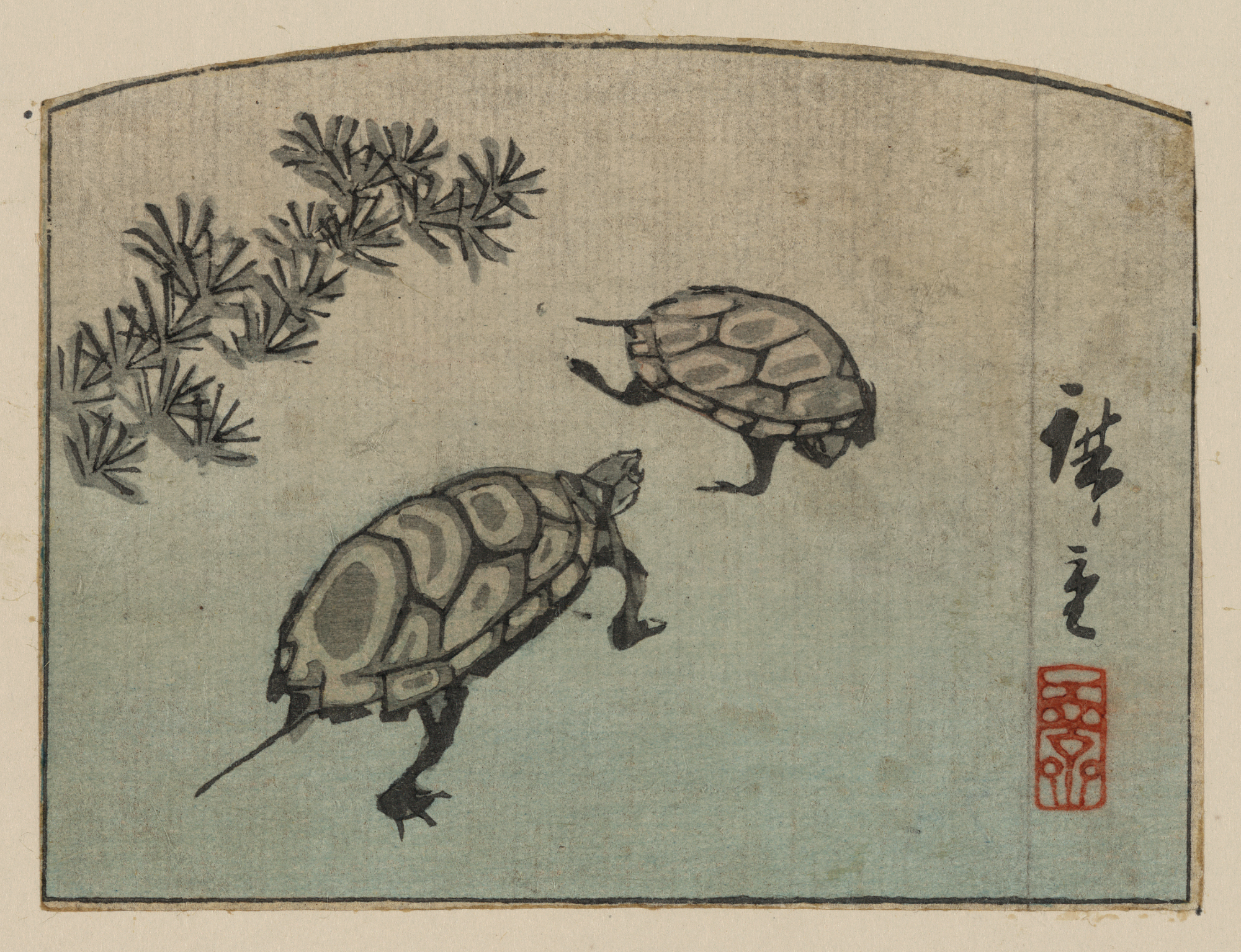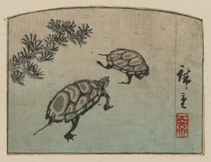TITLE: KameTITLE TRANSLATION: Turtles. CALL NUMBER: FP 2 - JPD, no. 765 (A size) [P&P]Restricted access; material extremely fragile; please use online digital image. REPRODUCTION NUMBER: LC-DIG-jpd-00843 (digital file from original print) RIGHTS INFORMATION: No known restrictions on publication. SUMMARY: Print shows two turtles. MEDIUM: 1 print : woodcut, color ; 8.9 x 11.9 cm. CREATED/PUBLISHED: [between 1848 and 1858] CREATOR: Andō, Hiroshige, 1797-1858, artist. NOTES: Title and other descriptive information compiled by Nichibunken-sponsored Edo print specialists in 2005-06. Format: Nishikie. Part of a Harimaze-e. Forms part of: Japanese prints and drawings (Library of Congress). SUBJECTS: Turtles--Japan--1840-1860. FORMAT: Ukiyo-e Japanese Color 1840-1860.Woodcuts Japanese Color 1840-1860. REPOSITORY: Library of Congress Prints and Photographs Division Washington, D.C. 20540 USA http://hdl.loc.gov/loc.pnp/pp.print DIGITAL ID: (digital file from original print) jpd 00843 http://hdl.loc.gov/loc.pnp/jpd.00843 CONTROL #: 2008660120