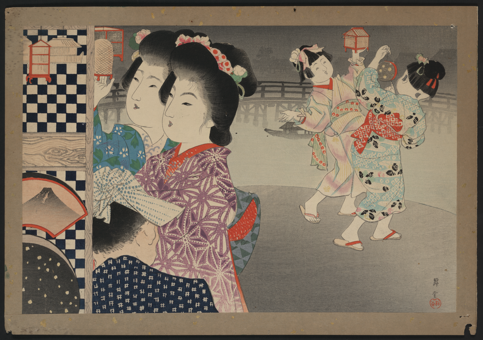 TITLE: Hotaru kagoTITLE TRANSLATION: Firefly cage. CALL NUMBER: FP 2 - JPD, no. 1353 (A size) [P&P]Restricted access; material extremely fragile; please use online digital image. REPRODUCTION NUMBER: LC-DIG-jpd-01498 (digital file from original print) RIGHTS INFORMATION: No known restrictions on publication. SUMMARY: Print shows women and children playing with firefly cages. MEDIUM: 1 print : woodcut, color ; 19.9 x 29.8 cm. CREATED/PUBLISHED: [190-] CREATOR: Yamamoto, Shōkoku, 1870-1965, artist. NOTES: Title and other descriptive information compiled by Nichibunken-sponsored Edo print specialists in 2005-06. From the series: Children of the twelve months. Format: horizontal Oban Nishikie, trimmed. Forms part of: Japanese prints and drawings (Library of Congress). SUBJECTS: Women--Clothing & dress--Japan--1900-1910. Children--Clothing & dress--Japan--1900-1910. Fireflies--1900-1910. Cages--Japan--1900-1910. Play (Recreation)--Japan--1900-1910. FORMAT: Ukiyo-e Japanese Color 1900-1910.Woodcuts Japanese Color 1900-1910. REPOSITORY: Library of Congress Prints and Photographs Division Washington, D.C. 20540 USA http://hdl.loc.gov/loc.pnp/pp.print DIGITAL ID: (digital file from original print) jpd 01498 http://hdl.loc.gov/loc.pnp/jpd.01498 CONTROL #: 2008660365