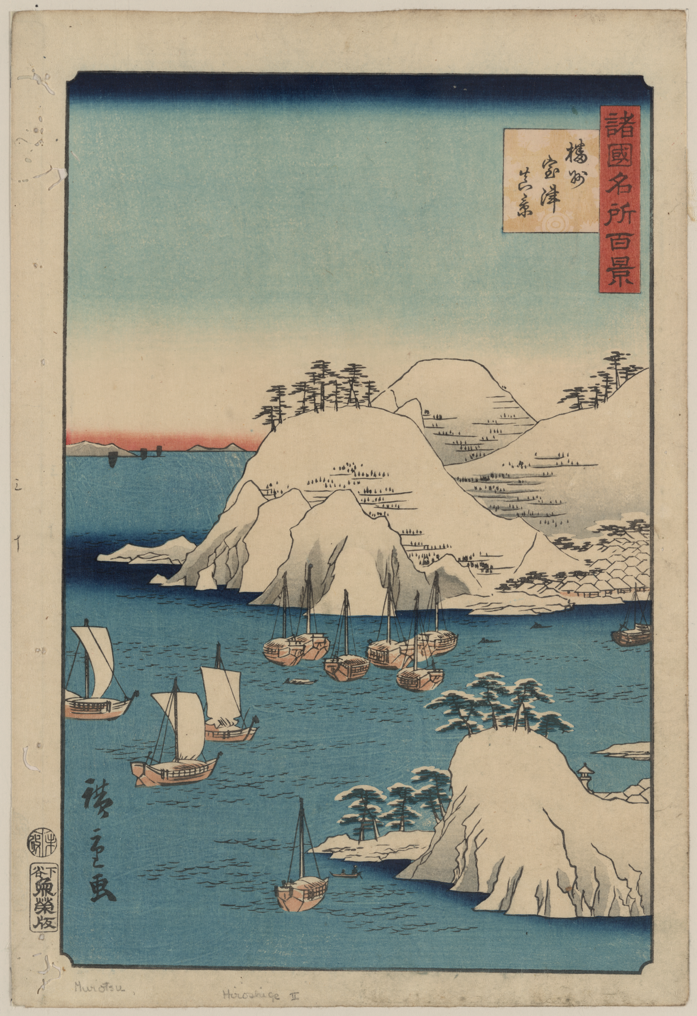 TITLE: Banshū murotsu shunkeiTITLE TRANSLATION: New view of Banshū Morotsu. CALL NUMBER: FP 2 - JPD, no. 63 (A size) [P&P]Restricted access; material extremely fragile; please use online digital image. REPRODUCTION NUMBER: LC-DIG-jpd-00066 (digital file from original print) RIGHTS INFORMATION: No known restrictions on publication. SUMMARY: Print shows bird's-eye view of harbor with boats and mountains. MEDIUM: 1 print : woodcut, color ; 37.1 x 25.2 cm. CREATED/PUBLISHED: 1859. CREATOR: Utagawa, Hiroshige, 1826?-1869, artist. NOTES: Title and other descriptive information compiled by Nichibunken-sponsored Edo print specialists in 2005-2006. From the series: Shokoku meisyō hyakkei : 100 famous places of Japan. Format: Oban Nishikie. Forms part of: Japanese prints and drawings (Library of Congress). SUBJECTS: Harbors--Japan--1850-1860. Sailing ships--Japan--1850-1860. Mountains--Japan--1850-1860. FORMAT: Ukiyo-e Japanese 1850-1860.Bird's-eye view prints Japanese 1850-1860.Woodcuts Japanese Color 1850-1860. REPOSITORY: Library of Congress Prints and Photographs Division Washington, D.C. 20540 USA http://hdl.loc.gov/loc.pnp/pp.print DIGITAL ID: (digital file from original print) jpd 00066 http://hdl.loc.gov/loc.pnp/jpd.00066 CONTROL #: 2009615058