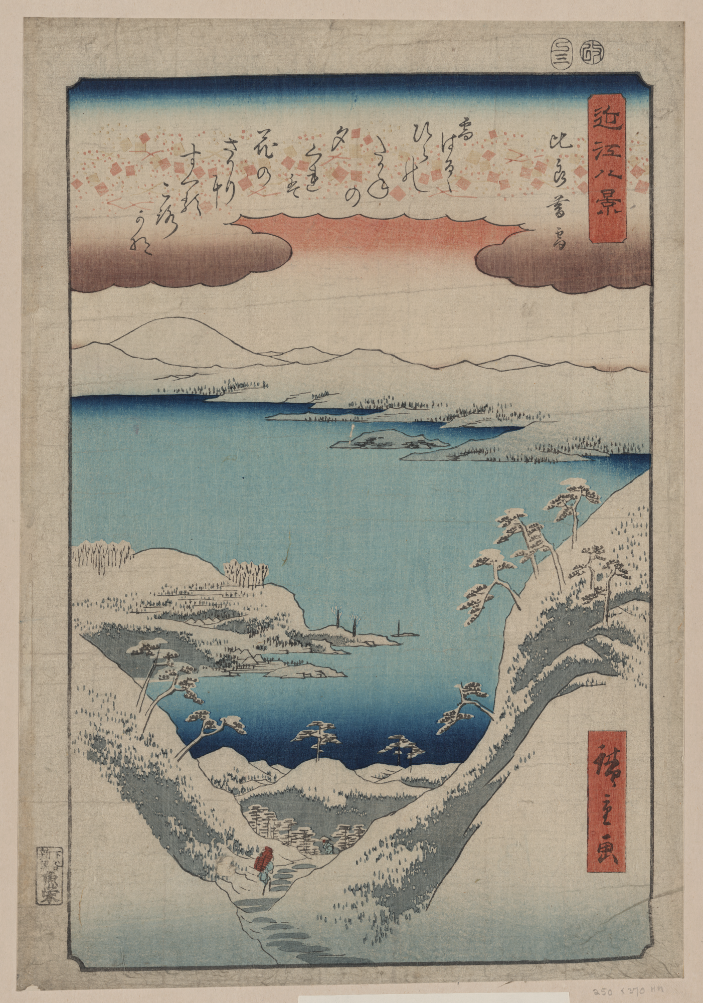 TITLE: Hira no bosetsuTITLE TRANSLATION: Evening snow at Hira. CALL NUMBER: FP 2 - JPD, no. 335 (A size) [P&P]Restricted access; material extremely fragile; please use online digital image. REPRODUCTION NUMBER: LC-DIG-jpd-00338 (digital file from original print) RIGHTS INFORMATION: No known restrictions on publication. SUMMARY: Print shows a winter scene with a man walking down a trail through mountains toward a large body of water. MEDIUM: 1 print : woodcut, color ; 37.2 x 25.4 cm. CREATED/PUBLISHED: 1857. CREATOR: Andō, Hiroshige, 1797-1858, artist. NOTES: Title and other descriptive information compiled by Nichibunken-sponsored Edo print specialists in 2005-2006. From the series: Ōmi hakkei : Eight views of Ōmi Province. Format: Vertical Oban Nishikie. Forms part of: Japanese prints and drawings (Library of Congress). SUBJECTS: Snow--Japan--1850-1860. Winter--Japan--1850-1860. Passes (Landforms)--Japan--1850-1860. FORMAT: Ukiyo-e Japanese 1850-1860.Woodcuts Japanese Color 1850-1860. REPOSITORY: Library of Congress Prints and Photographs Division Washington, D.C. 20540 USA http://hdl.loc.gov/loc.pnp/pp.print DIGITAL ID: (digital file from original print) jpd 00338 http://hdl.loc.gov/loc.pnp/jpd.00338 CONTROL #: 2009615327