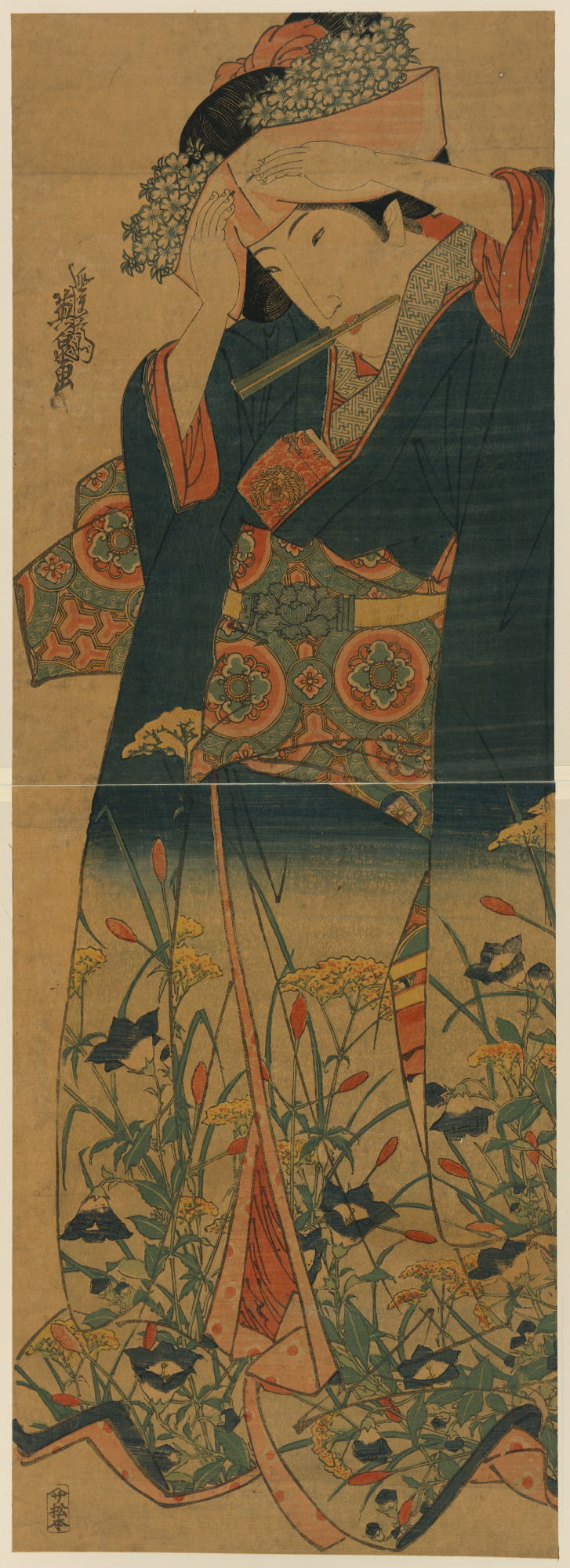 TITLE: Agebōshi o naosu musumeTITLE TRANSLATION: Young woman adjusting her hat. CALL NUMBER: FP 2 - JPD, no. 709 (A size) [P&P]Restricted access; material extremely fragile; please use online digital image. REPRODUCTION NUMBER: LC-DIG-jpd-00779 (digital file from original print) RIGHTS INFORMATION: No known restrictions on publication. SUMMARY: Print shows a woman, full-length portrait, standing, facing left, adjusting her hat, holding folded fan in her mouth. MEDIUM: 1 print (2 sheets) : woodcut, color ; 36 x 25.3 (top), 35.6 x 25 (bottom) cm. CREATED/PUBLISHED: [between 1825 and 1830] CREATOR: Ikeda, Eisen, 1790-1848, artist. NOTES: Title and other descriptive information compiled by Nichibunken-sponsored Edo print specialists in 2005-06. Format: Vertical Oban Nishikie Vertical Diptych. Forms part of: Japanese prints and drawings (Library of Congress). SUBJECTS: Women--Clothing & dress--Japan--1820-1830. Beauty--Japan--1820-1830. Hats--1820-1830. FORMAT: Pillar prints 1820-1830.Ukiyo-e 1820-1830.Woodcuts Japanese Color 1820-1830. REPOSITORY: Library of Congress Prints and Photographs Division Washington, D.C. 20540 USA http://hdl.loc.gov/loc.pnp/pp.print DIGITAL ID: (digital file from original print) jpd 00779 http://hdl.loc.gov/loc.pnp/jpd.00779 CONTROL #: 2008660042