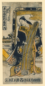 TITLE: Hidari izutsu no mae CALL NUMBER: FP 2 - JPD, no. 2189 (C size) [P&P]Restricted access: Materials extremely fragile; please use online digital image. REPRODUCTION NUMBER: LC-DIG-jpd-02570 (digital file from original print) RIGHTS INFORMATION: No known restrictions on publication. SUMMARY: Print shows a geisha, standing, playing a zither. MEDIUM: 1 print : woodcut, hand-colored ; 30.6 x 14.8 cm. CREATED/PUBLISHED: [between 1726 and 1736] CREATOR: Nishimura, Shigenaga, 1697-1756, artist. NOTES: Title and other descriptive information compiled by Nichibunken-sponsored Edo print specialists in 2005-06. Format: Hosoban Urushie. From the series: Bijin sanpukutsui : Triptych of Beauties. Typed caption on mount: Lady Uchitsutsu : a series of three prints on beautiful ladies; (One of a series of three virtues represented by girls). Signed: Eishi Nishimura Shigenobu. Forms part of: Japanese prints and drawings (Library of Congress). SUBJECTS: Zithers--Japanese--1720-1740. Geishas--1720-1740. FORMAT: Ukiyo-e 1720-1740.Woodcuts Japanese Color 1720-1740. REPOSITORY: Library of Congress Prints and Photographs Division Washington, D.C. 20540 USA http://hdl.loc.gov/loc.pnp/pp.print DIGITAL ID: (digital file from original print) jpd 02570 http://hdl.loc.gov/loc.pnp/jpd.02570 CONTROL #: 2004676711