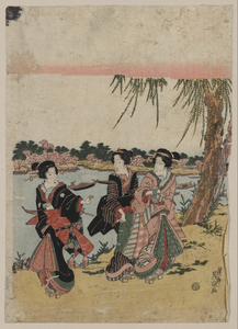 TITLE: Mimeguri no hanamiTITLE TRANSLATION: Cherry blossoms at Mimeguri. CALL NUMBER: FP 2 - JPD, no. 755 (A size) [P&P]Restricted access; material extremely fragile; please use online digital image. REPRODUCTION NUMBER: LC-DIG-jpd-00833 (digital file from original print) RIGHTS INFORMATION: No known restrictions on publication. SUMMARY: Print shows three women standing on the bank of a river, viewing cherry blossoms; they are wearing geta. MEDIUM: 1 print : woodcut, color ; 36.8 x 25.8 cm. CREATED/PUBLISHED: [between 1818 and 1821] CREATOR: Ikeda, Eisen, 1790-1848, artist. NOTES: Title and other descriptive information compiled by Nichibunken-sponsored Edo print specialists in 2005-06. Format: One panel of a Vertical Oban Nishikie Triptych. Possibly a later impression. Forms part of: Japanese prints and drawings (Library of Congress). SUBJECTS: Women--Social life--Japan--1810-1830. Women--Clothing & dress--Japan--1810-1830. Cherry trees--Japan--1810-1830. Shoes--Japan--1810-1830. FORMAT: Ukiyo-e Japanese Color 1810-1830.Woodcuts Japanese Color 1810-1830. REPOSITORY: Library of Congress Prints and Photographs Division Washington, D.C. 20540 USA http://hdl.loc.gov/loc.pnp/pp.print DIGITAL ID: (digital file from original print) jpd 00833 http://hdl.loc.gov/loc.pnp/jpd.00833 CONTROL #: 2008660110