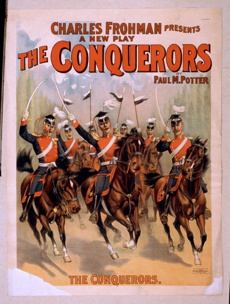 TITLE: Charles Frohman presents a new play, The conquerors by Paul M. Potter. CALL NUMBER: POS - TH - 1897 .C65, no. 1 (C size) <P&P>[P&P] REPRODUCTION NUMBER: LC-USZ6-499 (b&w film copy neg.) RIGHTS INFORMATION: No known restrictions on publication. MEDIUM: 1 print (poster) : lithograph, color ; 100 x 75 cm. CREATED/PUBLISHED: Cin'ti ; New York : Strobridge Lith. Co., c1897. CREATOR: Strobridge & Co. Lith. RELATED NAMES: Frohman, Charles, 1860-1915. Potter, Paul M. (Paul Meredith), 1853-1921. NOTES: Created and "copyright 1897 by The Strobridge Lith Co, Cin'ti & New York." Caption: The conquerors. N.Y. no. 7928. SUBJECTS: Cavalry. Daggers & swords. Horses. Melodramas. FORMAT: Theatrical posters American.Lithographs Color. OTHER TITLE: Conquerors. PART OF: Theatrical Poster Collection (Library of Congress) REPOSITORY: Library of Congress Prints and Photographs Division Washington, D.C. 20540 USA DIGITAL ID: (digital file from intermediary roll copy film) var 2077 http://hdl.loc.gov/loc.pnp/var.2077 CONTROL #: var1994000890/PP