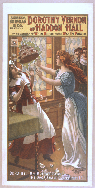 TITLE: Sweely, Shipman & Co. present Dorothy Vernon of Haddon Hall by the authors of When knighthood was in flower. CALL NUMBER: POS - TH - 1906 .D67, no. 3 (B size) <P&P>[P&P] REPRODUCTION NUMBER: _ _ _ _ _ RIGHTS INFORMATION: No known restrictions on publication. MEDIUM: 1 print (poster) : lithograph, color ; 46 x 23 cm. CREATED/PUBLISHED: Cincinnati ; New York : U.S. Lithograph Co., c1906. CREATOR: U.S. Lithograph Co. RELATED NAMES: Sweely, Shipman & Co. NOTES: Created and "copyright 1906 by The U.S. Lithograph Co., Russell-Morgan Print, Cincinnati & New York." Caption: Dorothy: "My bridal cake! The dogs shall eat it, not I!" No. 9746. SUBJECTS: Anger. Women--Clothing & dress. Historical dramas. FORMAT: Theatrical posters American.Lithographs Color. OTHER TITLE: Dorothy Vernon of Haddon Hall. PART OF: Theatrical Poster Collection (Library of Congress) REPOSITORY: Library of Congress Prints and Photographs Division Washington, D.C. 20540 USA DIGITAL ID: (digital file from intermediary roll copy film) var 0051 http://hdl.loc.gov/loc.pnp/var.0051 CONTROL #: var1993000052/PP