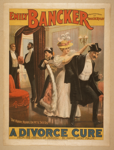 TITLE: A divorce cure from the French of Sardou by Harry Saint Maur. CALL NUMBER: POS - TH - 1897 .D58, no. 2 (C size) <P&P>[P&P] REPRODUCTION NUMBER: LC-USZ6-505 (b&w film copy neg.) RIGHTS INFORMATION: No known restrictions on publication. MEDIUM: 1 print (poster) : lithograph, color ; 101 x 76 cm. CREATED/PUBLISHED: Cincinnati ; New York : Strobridge Lith. Co., c1897. CREATOR: Strobridge & Co. Lith. RELATED NAMES: Ryley, Thos. W. Saint Maur, Harry. Sardou, Victorien, 1831-1908. NOTES: Created and "copyright 1897 by The Strobridge Lith. Co., Cincinnati & New York." Starring Emily Bancker ; management of Thos. W. Ryley. Caption: Oh! Harry, hurry, or he'll see us! N.Y. no. 7535. SUBJECTS: Bancker, Emily--Performances. Couples. Hiding. Servants. Theatrical productions. FORMAT: Theatrical posters American.Lithographs Color. PART OF: Theatrical Poster Collection (Library of Congress) REPOSITORY: Library of Congress Prints and Photographs Division Washington, D.C. 20540 USA DIGITAL ID: (digital file from intermediary roll copy film) var 0841 http://hdl.loc.gov/loc.pnp/var.0841 CONTROL #: var1994000892/PP